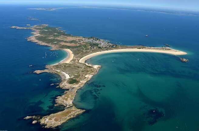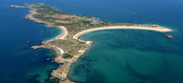 2- At Beg-er-Vachif, view of the islets Guric and Séniz, linked to the island by a small sandy tombolo that appears at low tide: herring, brown and great black-backed gulls, one of the main colonies of crested cormorants and oystercatchers.