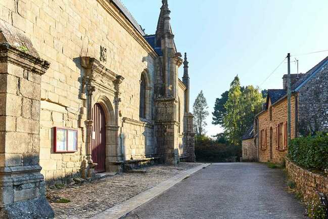 6- Continue along the wide track. After 500 m, take the sunken path to the right, which leads into the village of Sainte-Avoye, with the Chapelle in view. Classified as a historical monument, this Renaissance gem was built in the 16th century. The chapel impresses with its high bell-tower and substantial dimensions. Inside, it reveals an extremely fine décor and houses exceptional furnishings: one of the few rood screens still preserved in Brittany. This remarkable piece of polychrome woodwork is entirely carved with figures, fantastical animals and decorative motifs. Open from mid-June to mid-September. Walk around the chapel, then up the road to the parking lot.