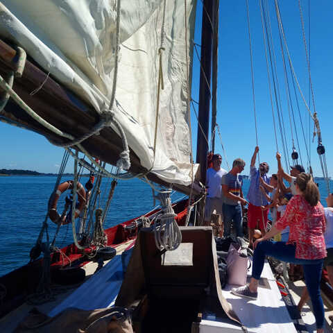 Traversée de la Baie de Quiberon. Navigation à la voile, au milieu de l'intégralité des flottilles de la semaine du Golfe avant qu'elles entrent dans le Golfe. Positionnement entre les îles du Golfe quelques minutes avant le lancement de la grande parade. Admirez le spectacle de ces navires de légende en train de glisser dans les courants du Golfe du Morbihan, le tout sur un navire spacieux et confortable.