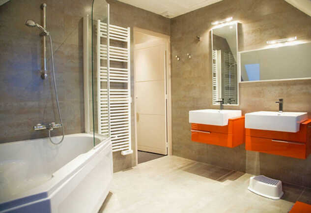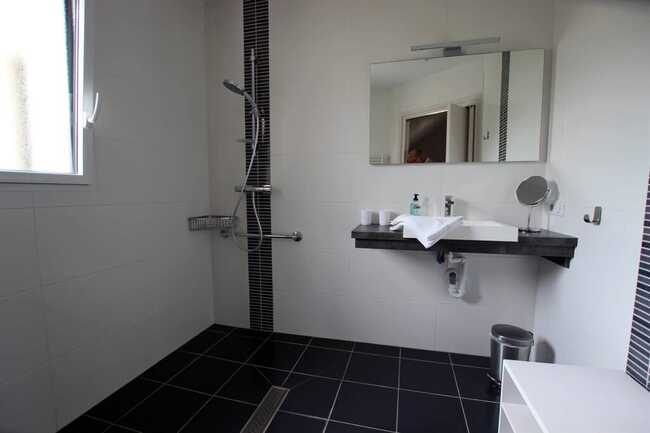 Upstairs: a large bedroom with 4 beds (90/200) that can be moved closer together, a dressing room, a bathroom (with bath and shower) and a separate toilet.