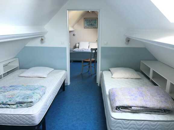 Upstairs, a master bedroom with a double bed (140cm) and a mezzanine with two single beds (120cm and 90cm).