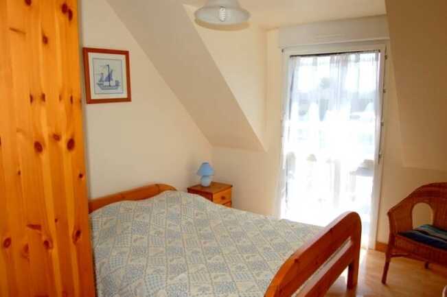 - One bedroom with double bed and wardrobe (shelves and hanging space).