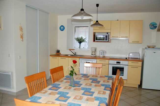 - a living room: A bright, warm space including a sitting area with leather sofa and armchairs, flat-screen TV, as well as a convivial dining room. The open kitchen is fully equipped to facilitate your meals with family or friends: dishwasher, oven, fridge-freezer, microwave, ceramic hob, coffee maker, toaster, kettle, as well as all the kitchen accessories you need to feel at home.