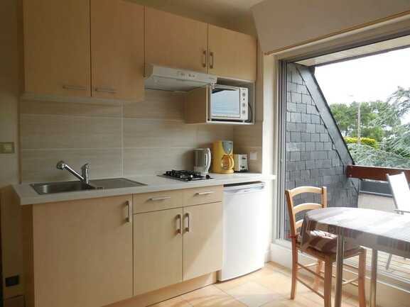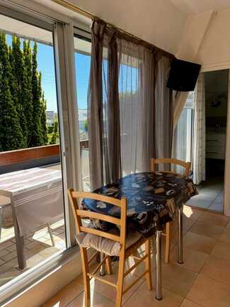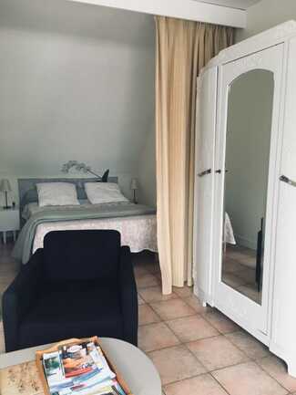 350m from beaches, town center, near Côte sauvage. Studio 21 m2 with terrace, very bright. Located on the first floor of a house with its own entrance, surrounded by a garden and enclosed parking area, equipped kitchenette, double bed, bathroom, shared washing machine, bike room, linen rental available.