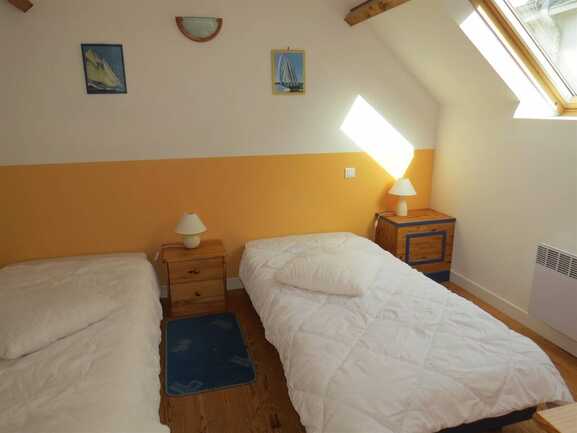 Upstairs, 2 bedrooms, one with 1 double bed, the other with 2 single beds. Shower.