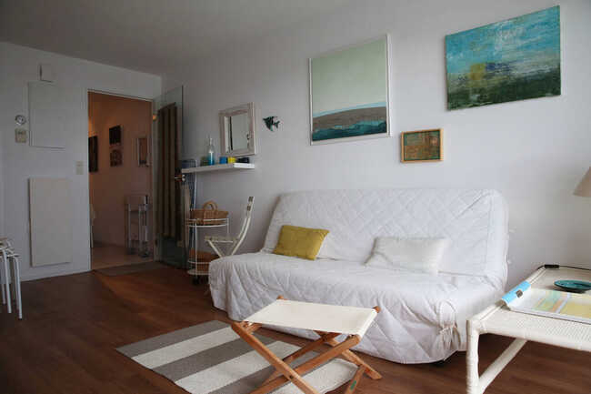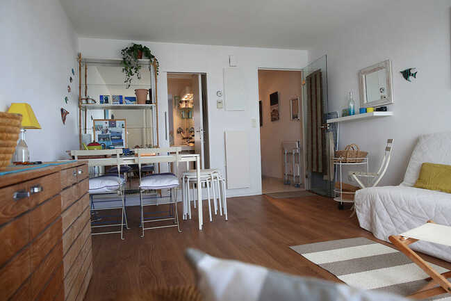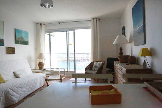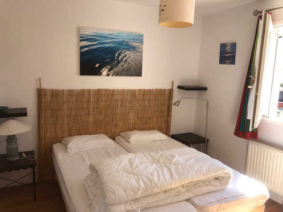 2-room apartment, sleeps 3. View of port and sea. Beach 200 m away. Quiet location. Balcony with dining area, 1 2-person bedroom overlooking west courtyard, 1 sofa bed in living room. Equipped kitchenette (dishwasher, washing machine, microwave). En-suite bathroom. Separate WC.