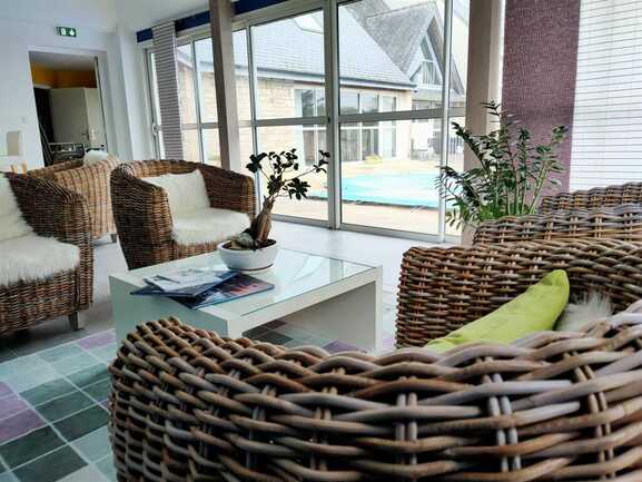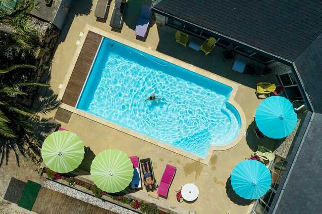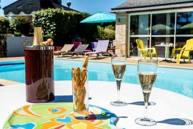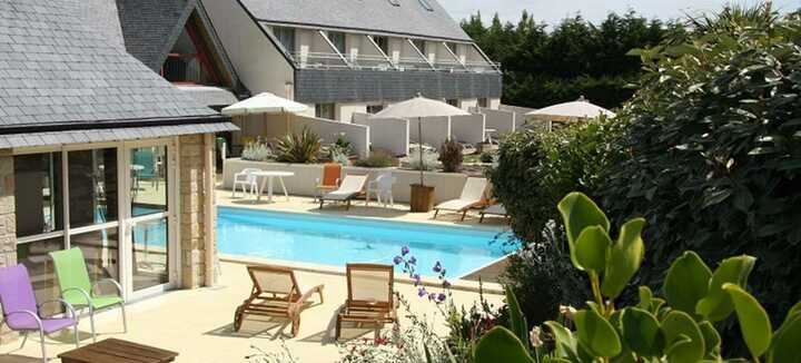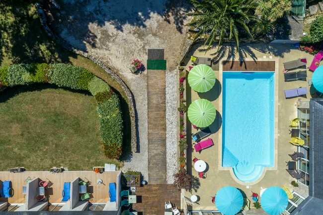 Our hotel has 20 comfortable rooms, including 10 ground-floor superior rooms (20m² with private terrace), 5 classic rooms and 5 family rooms (5 Pers) with balcony, where you can relax and enjoy the Breton sunshine. For a moment of absolute well-being, sit by our swimming pool, savor a "land-sea" aperitif plank garnished with fresh oysters and let yourself be lulled by the peacefulness of the surroundings.