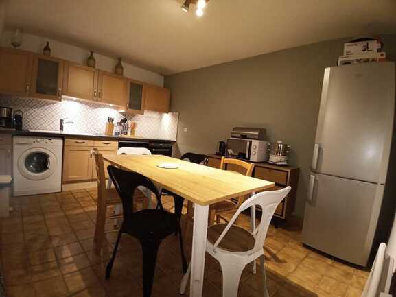 fridge/freezer, microwave, traditional and Nespresso coffee maker, kettle, toaster, raclette machine, electric mixer, electric juicer, hand blender, mini-chopper, two low sideboards, bottle rack, table and six chairs,