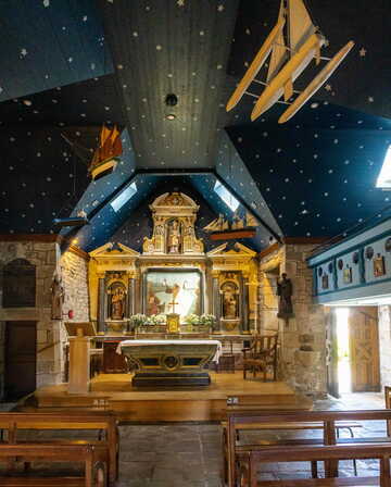 If you were to look at one single and unique building in Saint-Philibert, it would have to be the chapel located on the banks of the river Ster. It has an exceptional setting in Quiberon Bay! Located by the sea, this 17th and 18th century edifice once depended on Locmariaquer. Inside, you can admire an 18th century altarpiece which has in its central part a romantic period painting depicting Saint Philibert disembarking in the Ster cove, after having sailed in a stone trough. The ceiling of the building is studded with stars and the stained glass windows are reminiscent of the municipality’s agricultural and oyster farming activities. A real picture-postcard that is preferably visited at high tide!