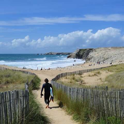 To fully enjoy these wide expanses and sea air, the marked trails offer you some very beautiful routes. On foot or by bike, you can measure the power of the ocean at its fullest. Stroll along the 8 km-long walking trails, and recharge your batteries in the midst of nature facing the often powerful and ever impressive sea. By bike, take the green lane and ride along the Wild coast to Quiberon.