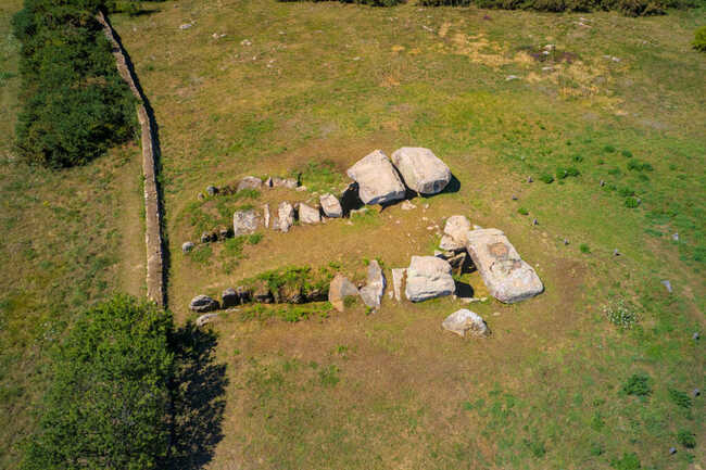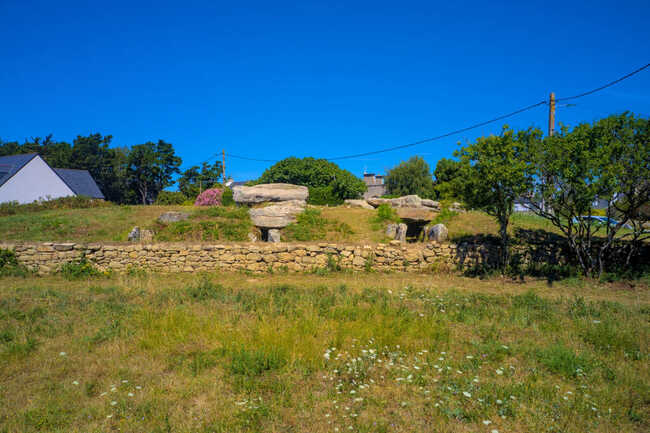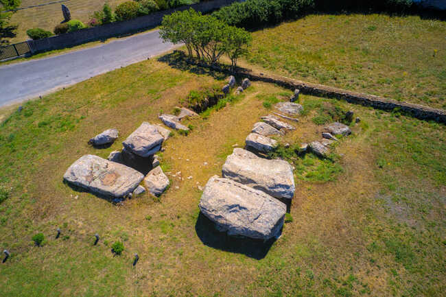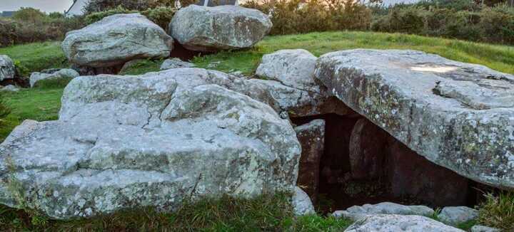Situated on a knoll 27m above sea level, it comprises three parallel corridor dolmens, one of which has a side chamber opening onto the main chamber. Late 19th-century gold bracelets from the Bronze Age have been found here.