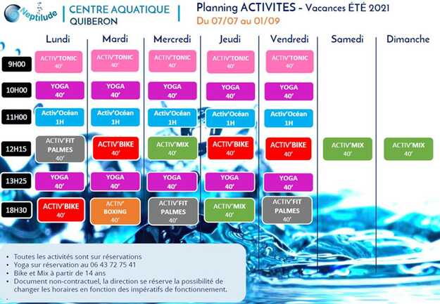 Aquatic activities for adults (AquaBike, AquaTonic, Aqua'Boxing... Longe-côte all summer).